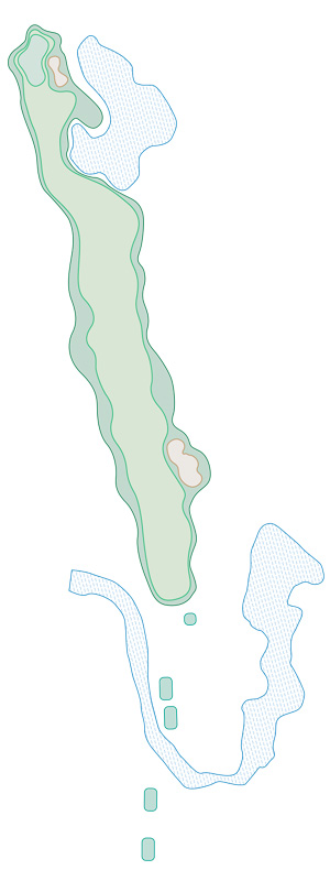 Par 5 mit Dogleg nach links, Drive in Richtung Bunker, dann zweiter Schlag vor Wasserhindernis, schmales Angehen des Greens, Aufpassen nicht über das Green hinaus zu spielen.