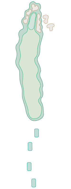 Court par 4 tout droit, hors limite à gauche, s’appuyer à droite sur la mise en jeu. Attaque de green très étroite défendue par des bunkers des deux côtés du green.